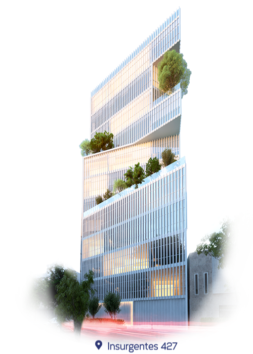 OFICINAS: 12 pisos 61 oficinas en módulos de 73 a 116 m² ESTACIONAMIENTOS: 6 sótanos Espacio para autos eléctricos y bicicletas. ESPACIOS MODULARES AAA: Te da la posibilidad de unir módulos y adquirir espacio contiguo de hasta 555 m² por planta. EDIFICIO SEGURO: Contamos con doble revisión estructural, doble filtro de seguridad 24/7: En acceso principal y Lobby EDIFICIO AUTOMATIZADO: Aíre acondicionado; Sistema de iluminación y sonido inteligente LUTRON, en áreas comunes; Gimnasio; Salas de Juntas; Roof Garden; Área Lounge para eventos, Restaurante / Bar (Con servicio exclusivo para usuarios)